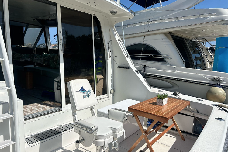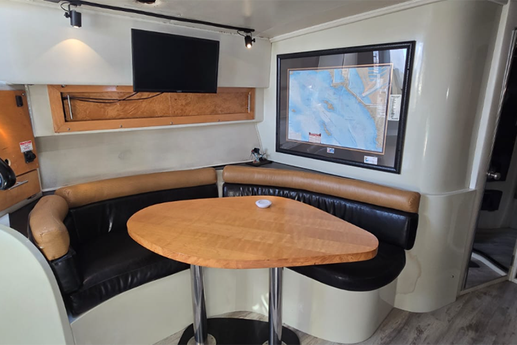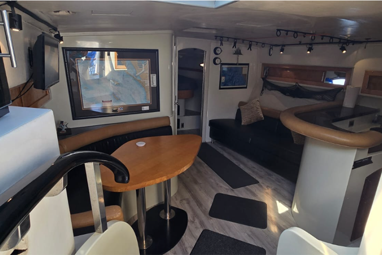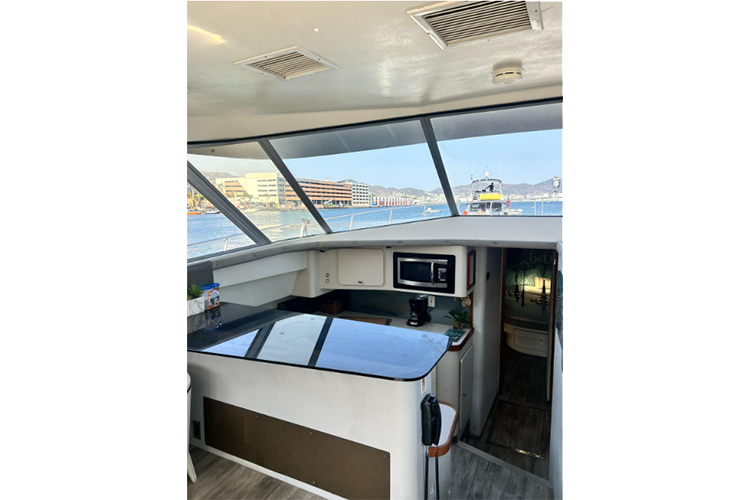 La embarcación cuenta con dos recámaras, tres baños, dos comedores, cocina, refrigerador, micro, parrilla, sala, flybridge, chalecos, flotis, aros, salvavidas, equipo, de pesca y toallas. Con AIRE ACONDICIONADO.